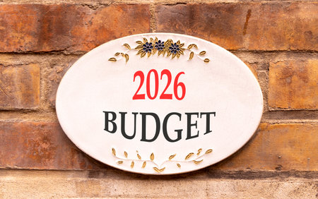 2026 Budget symbol. Concept words 2026 Budget on beautiful white sign. Beautiful old brown brick wall background. Business and 2026 budget concept. Copy space.