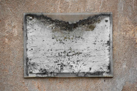 A metal rusty scratched blank plaque screwed with four screws to a stone wall. Vintage rough background with copy space. Real template