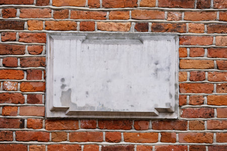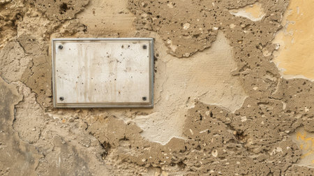A weathered brick wall features a blank concrete plaque, showing signs of age and wear, suggesting it once displayed important information or a dedication in a historical context.