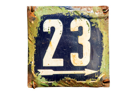 Old rusty plate with number 23, isolated on a white background.