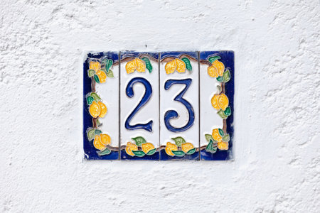 Close-up on a Number 23 in Faience on a concrete wall painted white.