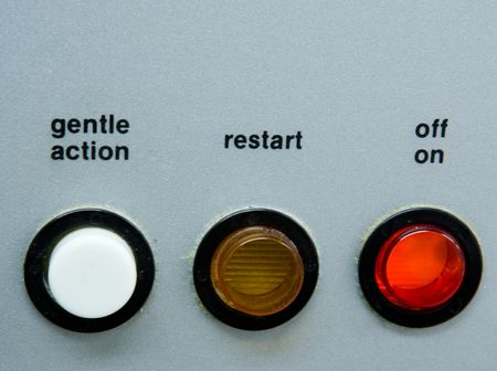 A closeup view of a vintage control panel featuring a test button and multiple switches for industrial or technological settings