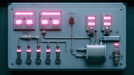 automated industrial factory control buttons overseeing the automated machinery where humans are no longer needed. computers and robot controls making more money for corporations.