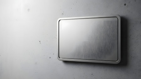 The image features a close-up of a red button set in a yellow square panel, attached to a wall. The button appears to be a control element. The composition is centered, with a neutral backdrop. It could be used for various purposes like design or technology.