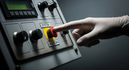 A gloved hand presses a red emergency shutdown button on a gray control panel with a digital display. This highlights critical system operation and control.
