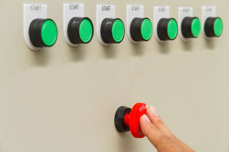 Anonymous man pressing an emergency stop industrial safety machine power off button, object detail, closeup Workplace safety rules, policies, security and incident response, risk and accidents concept