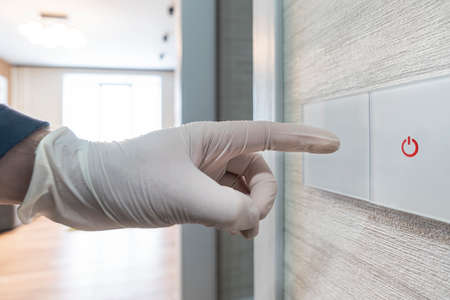 A hand in a white protective glove presses light switch. Risk of infection with viruses and bacteria in public places. Home hygiene.