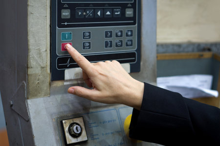 A close-up of a person pressing the emergency stop button on industrial equipmen