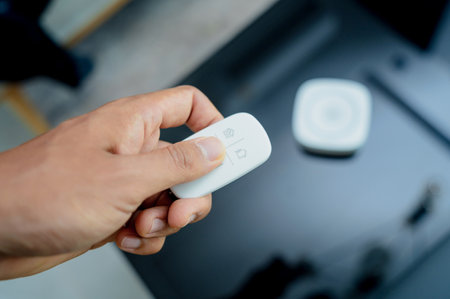 Businessman enters finger password lock code on alarm panel, on white wall, rear view of man with beard