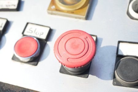 Red emergency stop and black reset button on machine for safety. Stop button switch. Selective focus and shallow dof.