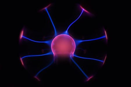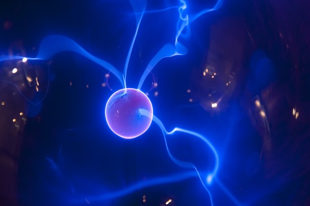 Plasma ball with electric blue and pink light trails radiating from a glowing core.