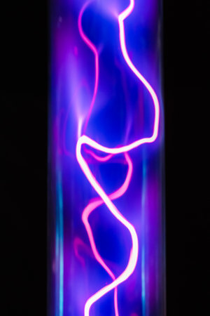 Glowing purple electricity bolts in glass tubes in a science lab.
