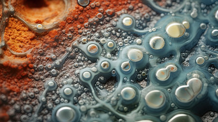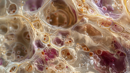 An artistic macro shot of a complex biological structure with a mix of colors and textures, possibly related to microbiology or cell biology.