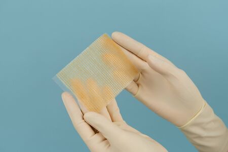female hand and brown medical adhesive plaster for the treatment of injuries and cuts on the skin, blue background