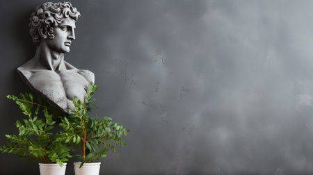 David's bust on gray background with long shadow. Minimal still life