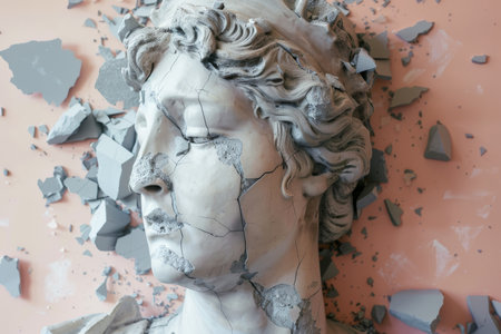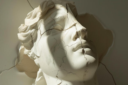 Close-up of a cracked classical sculpture with shadows and light play