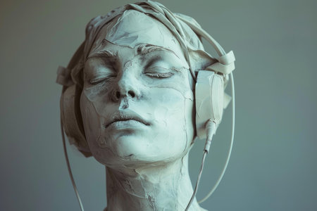 Artistic clay sculpture of a head with closed eyes wearing headphones, evoking tranquility