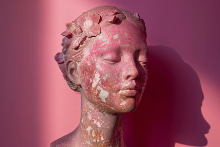Close-up of a textured sculpture head with flaking pink paint and rose adornment against a shadowed backdrop