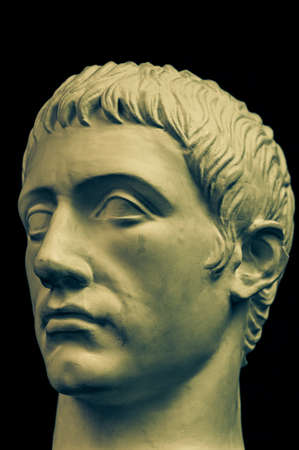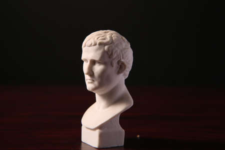 Gypsum copy of ancient statue Augustus head on dark textured background. Plaster sculpture man face.