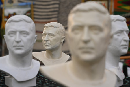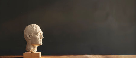 Historical bust on wooden desk, dramatic lighting, dark background.