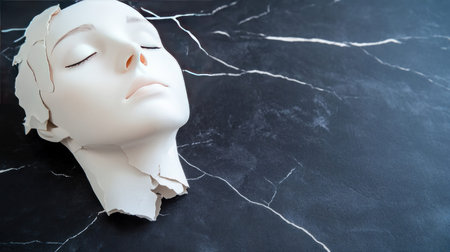 A white sculpture of a face with closed eyes rests on a dark, textured surface. The sculpture is broken at the neck.