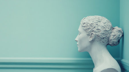 A sculpted head of a woman in a calm pose highlights the intricate details of her face, showcasing artistic craftsmanship against a softly colored backdrop.