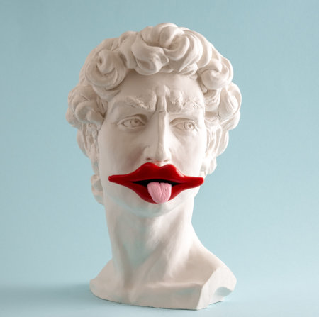 Antique statue is bust of David on blue background with his eyes closed. Concept of modern art and future vaporwave.