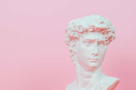 Antique bust of David with audio cassette on pink background. concept pop. Minimal still life. creative music layout