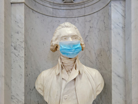 A bust of Thomas Jefferson in the Library of Congress wearing a single use disposable mask depicting the current coronavirus Covid-19 pandemic.