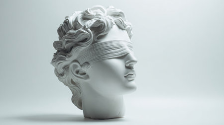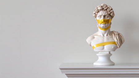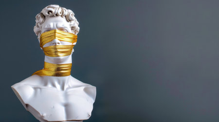 Classical white plaster bust adorned with shiny golden eye mask, set against a black background, representing a fusion of art and mystery. Front view, copy space.