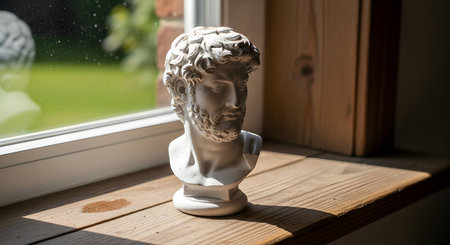 A small, white plaster bust of a bearded Greek or Roman figure, sitting on a wooden windowsill in natural sunlight. The window behind the statue looks out onto a green, sunlit garden.