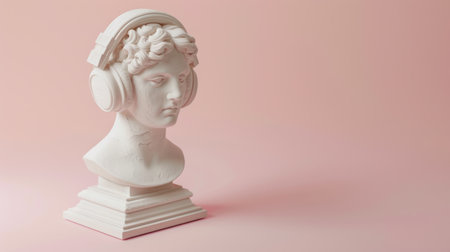 White sculpture of a classical bust with modern headphones on a pink background.
