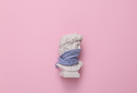 David bust with face mask and virus molecules on blue background. infection protection