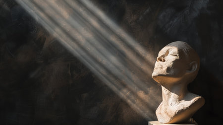 Shafts of light illuminate a clay bust, casting shadows on dark textured backdrop
