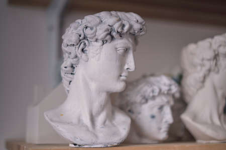 group of busts of David stand on a shelf. sculptors workspace. antique plaster busts