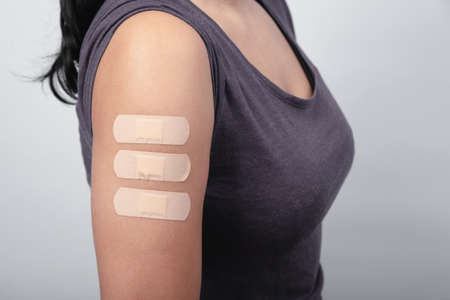 Woman showing arm with plasters after vaccine, mutation virus, immunization