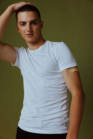 handsome man in white t-shirt band-aid on his arm covid vaccine passport