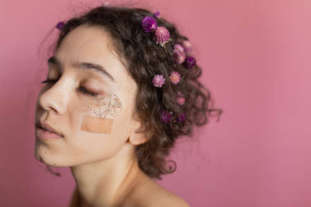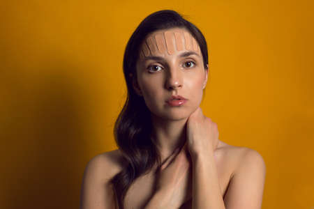 Attractive young woman with kinesiology tape. Beautician with kinesiology facelift tapes.