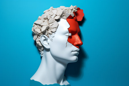 Exploring Modernity: A Vibrant Collage of Plaster Head, Statue, and Male Portrait, Set Against a Serene Blue Background