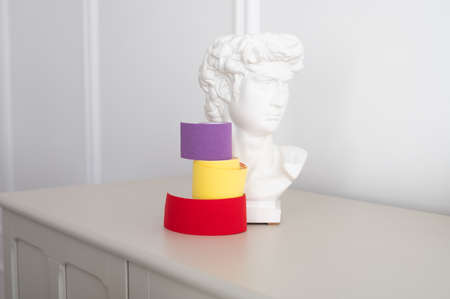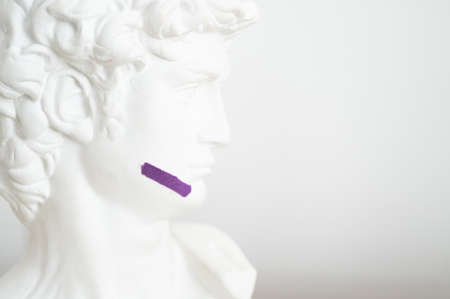 Gypsum statue of David head with kinesio tape. Face-taping, lifting treatment on face concept