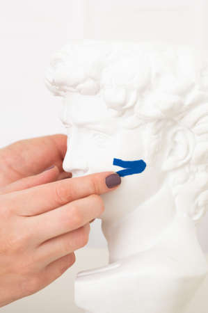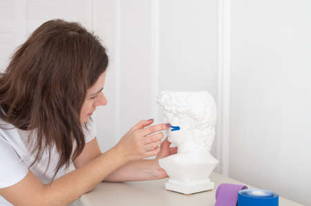 Physical therapist or cosmetologist placing tape on the pypsum statue of head. anti-aging procedure. aesthetic taping.