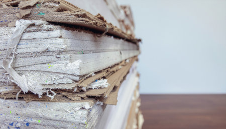 This image showcases a close-up view of stacked drywall sheets in a construction area, highlighting the texture and materials in a blurred backdrop.