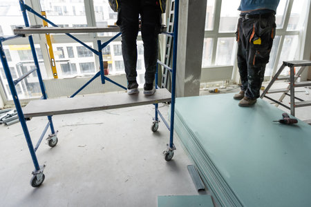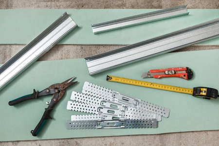 Working process of installing metal frames and plasterboard (drywall) for gypsum walls and materials are in apartment is under construction, remodeling, renovation, extension, restoration and reconstruction