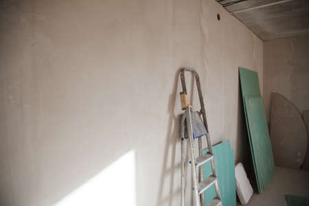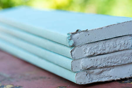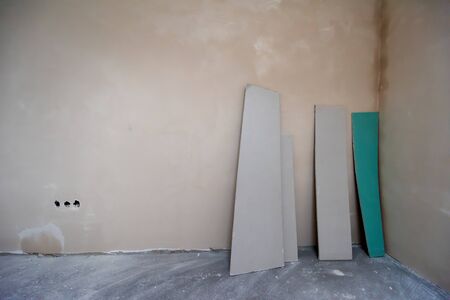Sheets of plasterboard or drywall (close up) in an apartment during on the renovation and construction