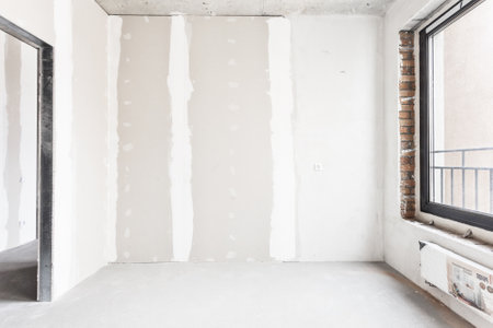 Sheets of drywall stacked on the floor, ample copy space in the background
