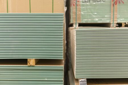 Drywall stacked in stacks at a hardware warehouse. Selective focus with blurred background.