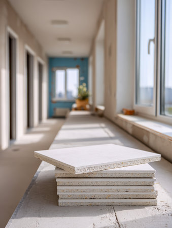 A neat pile of pale ceramic tiles rests on a sunny windowsill, hinting at a renovation project amidst a softly blurred hallway scene full of potential.