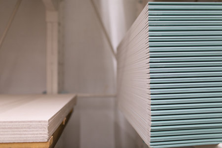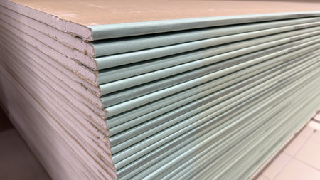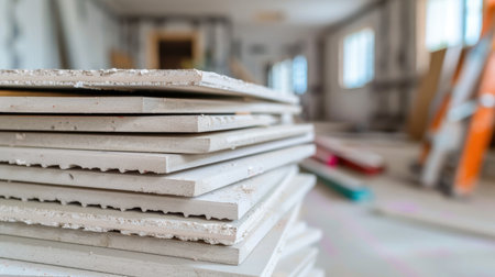 A close-up view of stacked drywall sheets in a construction site highlights the raw materials used for interior walls, surrounded by tools and light.