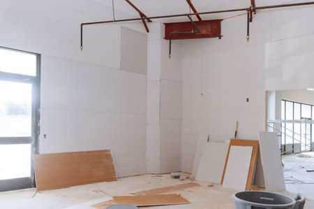 interior of construction site with drywall completely installed at new two level apartment work in progress to the new house
