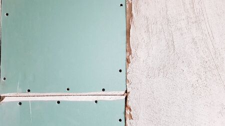 Unfinished wall in a building under construction made of plasterboard. Part of the wall is sheathed with drywall. Drywall is bolted to the wall in anticipation of plaster.